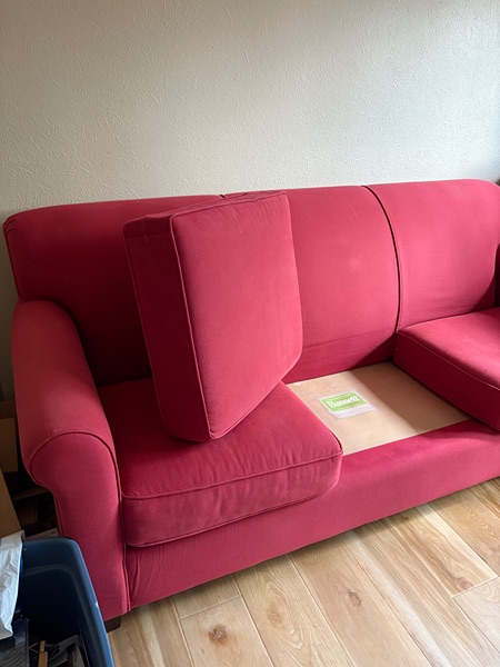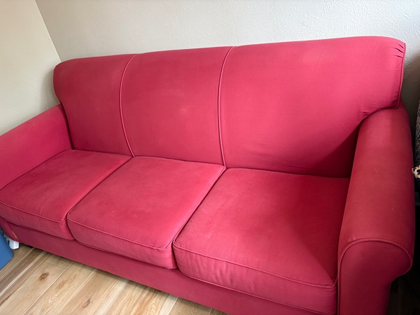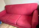For sale used 3 cushion Bassett sofa. Very sturdy and well made with some minor cosmetic sun fading to the color. Lovely rosy red with a durable fabric no stains. There is a dog that lives here but seldom if ever was on the sofa. Classic modern design. Measures 82L x 34W x 35H. Fairly heavy will need 2 people to pick up. 242/Gosling area