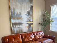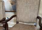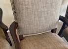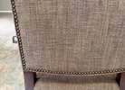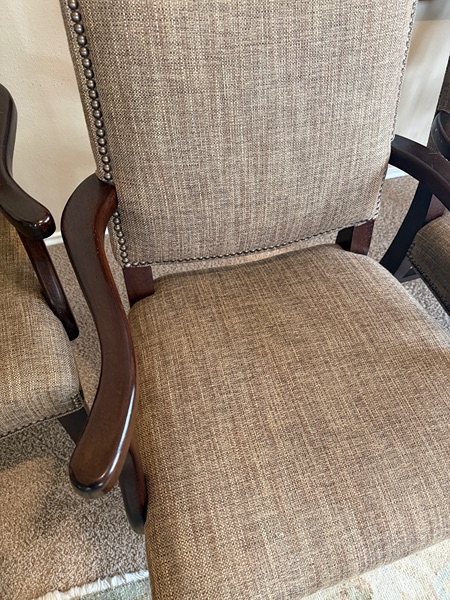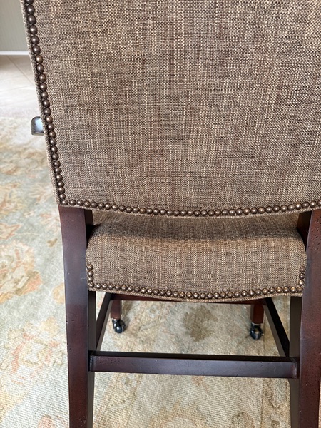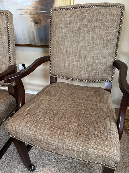 These beautiful Arm Chairs are custom. In the color “Tiara Brown” with a walnut finish and silver studded details. There’s no rips or stains. Caster wheels on all four chairs. In great condition.