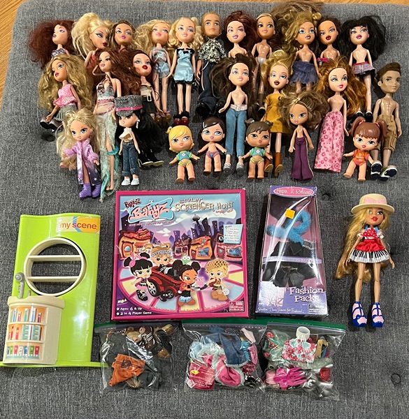 Bratz and My Scene lot of dolls and accessories! Mainly Bratz but a few my scene pieces as well! Trying to sell as a lot. Price is NOT $1 I am taking offers and put that there as a place holder:) a few things to note dolls are in pretty rough shape none (to my knowledge) are complete. One doll has had her arm cut off. But that is the only doll with a missing limb. Dolls have some marks, may have slight hair cuts and tangled hair, and missing original pieces. However the main "defect" is some of the dolls were bought second hand for a project (never ended up being used) and had a cigarette smell to them. I have since washed / cleaned the dolls. But may still have a faint smell to them. (If any). Lot includes all the dolls, clothes, accessories shown. As well as a bratz babies board game. Taking offers but please note the price is not $1 that is there as a placeholder:)