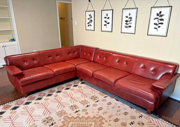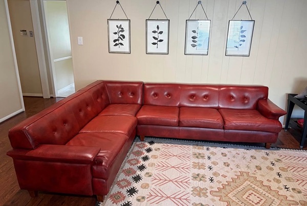 This sectional is GORGEOUS in person. Real Genuine leather, solid bones. Normal wear. From Urban Leather, she's oldie but a goodie.