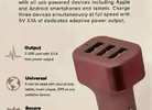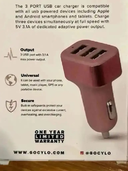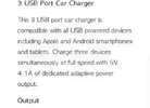 This 3 USB port car charger is compatible with all USB powered devices including Apple and Android smartphones and tablets. Charge three devices simultaneously at full speed with 5V 4.1A of dedicated adaptive power output.