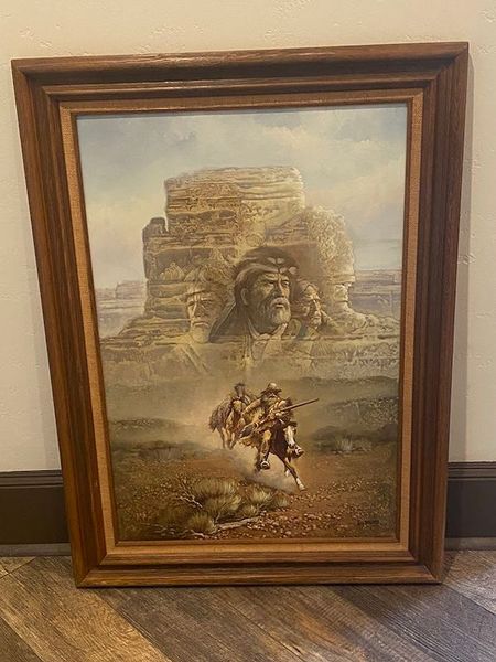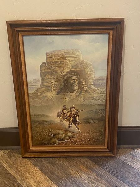 Gerald Bogard was a 20th-century American artist known for Native American-themed works, including depictions of scouts and warriors. This signed painting is in excellent condition. 'The Scout' is a western themed painting that would go great in anyone's home that is looking for this certain decor. Measuring with the frame it is 42 x 31.