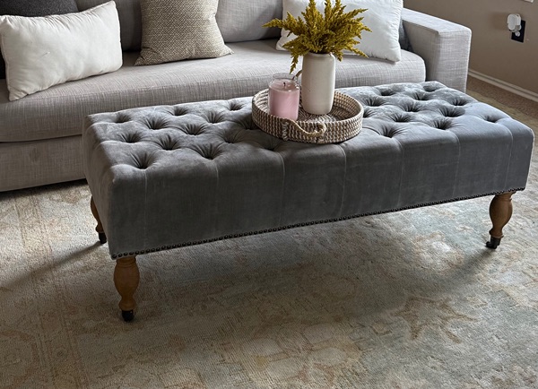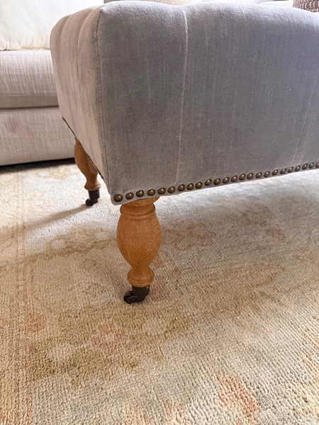 Gorgeous RH bench with caster wheels. Just been cleaned. A few stains which isn’t that noticeable but it is clean. Pretty gray velvet color with a chestnut oak legs.
