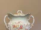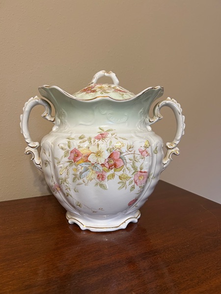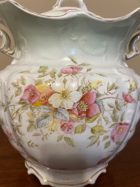 12-inch tall urn in excellent condition with no chips. Some minor discoloration on rim amd handles. Beautiful painting with texture on flowers.