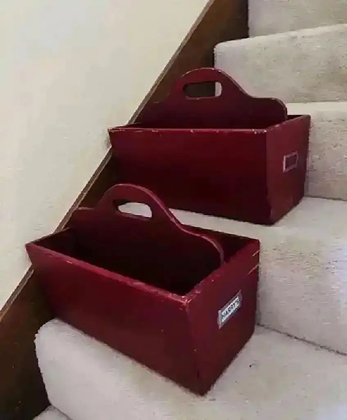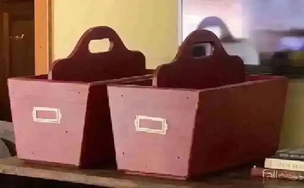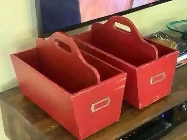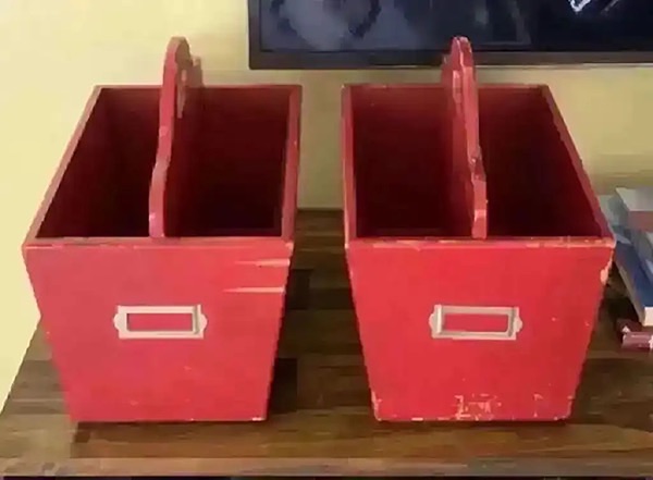 Pottery Barn Kids solid wood, red in color, distressed 15.5” x 9.25” x 12” used each beside twin beds and looked really cute and very useful. Also has slot on front for child’s name or other label. Could easily be repainted if too distressed for you.