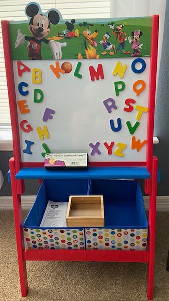 Delta Disney Activity Easel, 2-sided, white magnetic board on one side, chalk on the other. Very good condition. Includes with ONLY the capital letter set that came with the easel and an eraser.