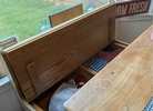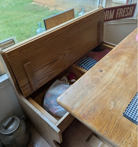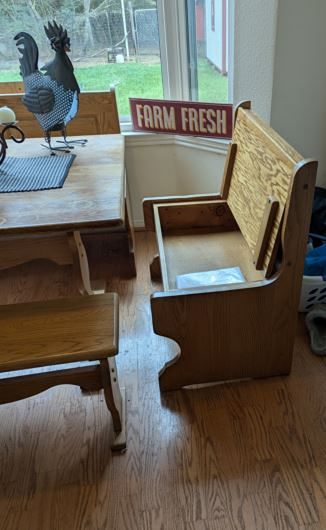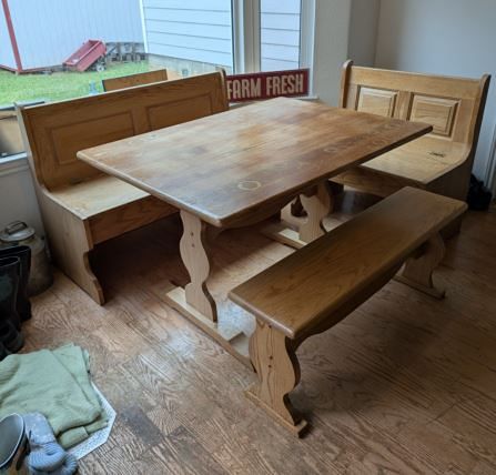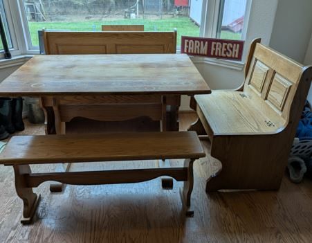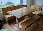 Up for sale - solid oak kitchen table. Both bench seats lift open for storage. Table top could use refinishing but otherwise in good condition. Two benches have solid oak corner piece that attach benches together for corner room use.