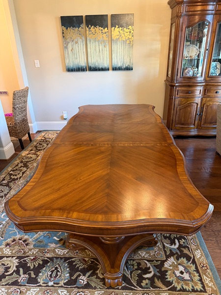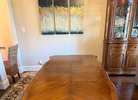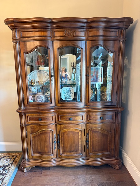 Elegant and Roomy Solid Fruitwood Table with 10 chairs and beautiful hutch with beveled glass door and tons of storage , lighted