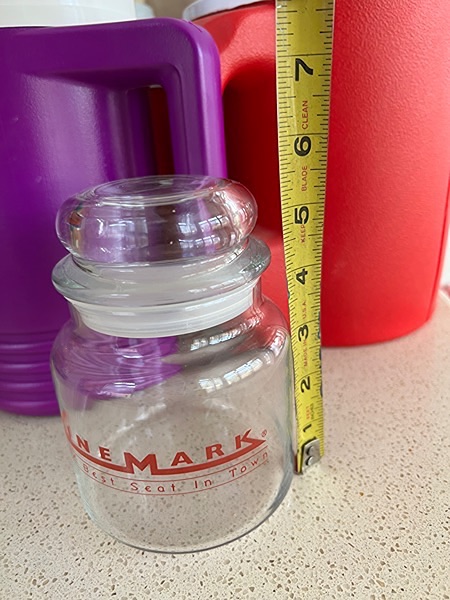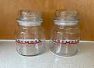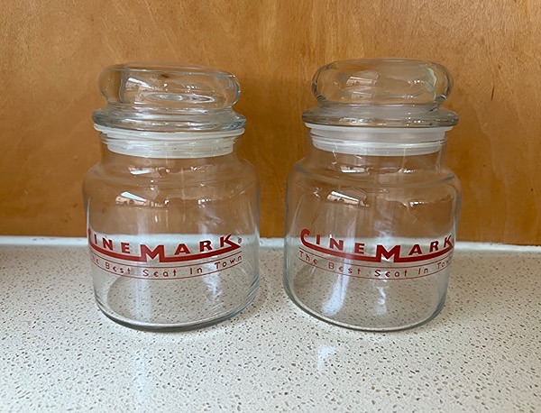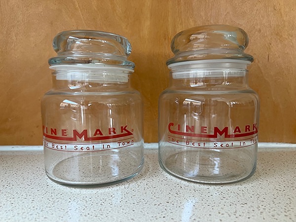 Set of 2 Cinemark branded glass canisters. Great for sorting and storing craft supplies! See pics for measurements…$8 firm