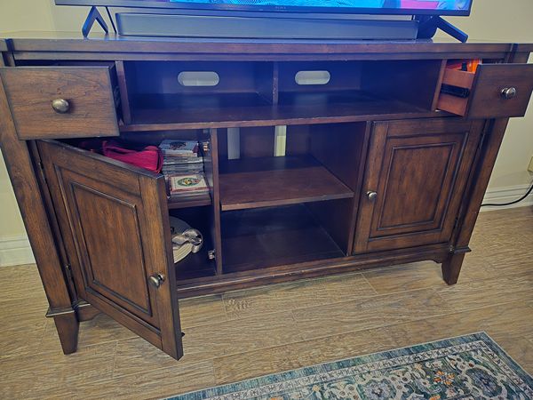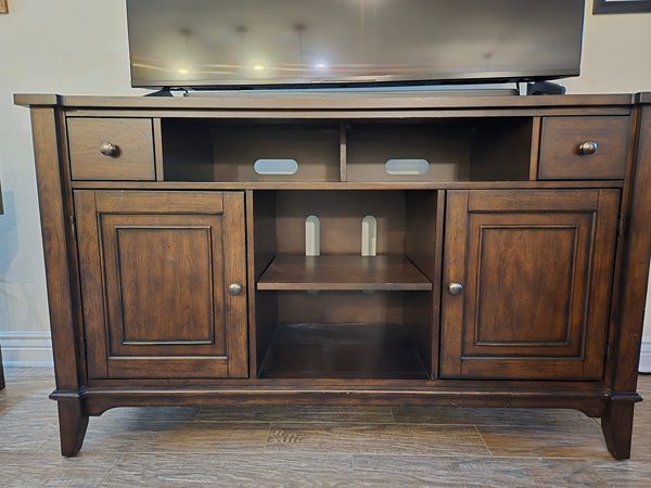 Wood tv cabinet. 30'H x 60'W x 24' D. Two small drawers and two cabinets with shelves. In great condition! Pick up only.