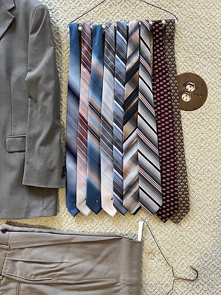 Gray suit jacket (40 long) with assorted ties (15 total!) and two pairs of pants (33 waist)…$20 total, firm