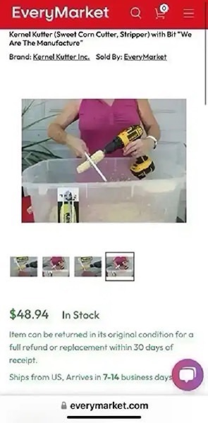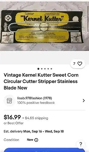 Strips kernels off ear of corn with one stroke!  New from Williams-Sonoma!  Great for making corn salads etc…$10 firm