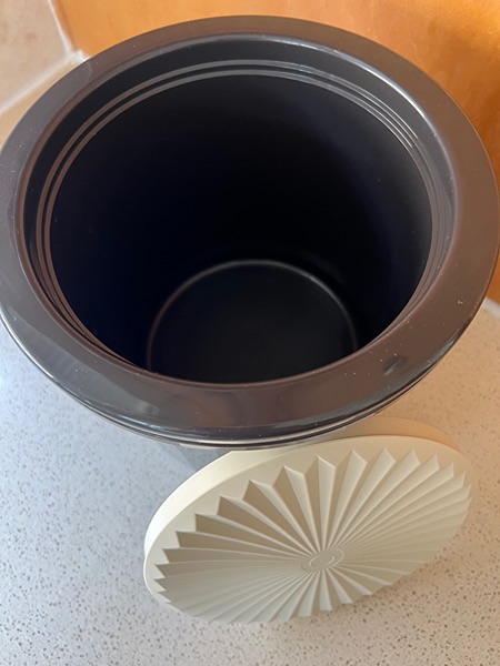 This retro Mocha brown Tupperware Ice Bucket is sturdy and functional. It has a removable inner liner & Tupperware's famous push button sealing lid.