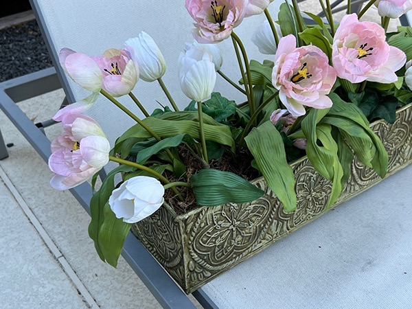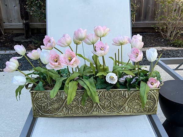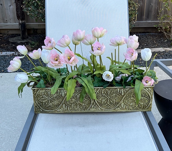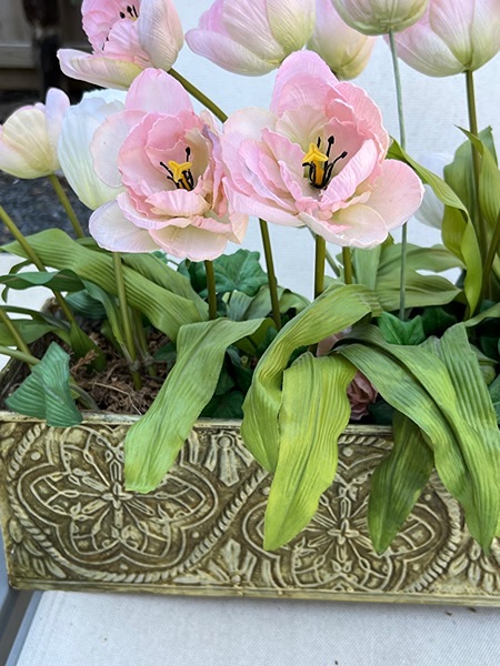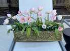 Large flower window box arrangement in decorative rectangular tin. Approx. 31" x 7" x 19"