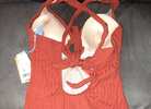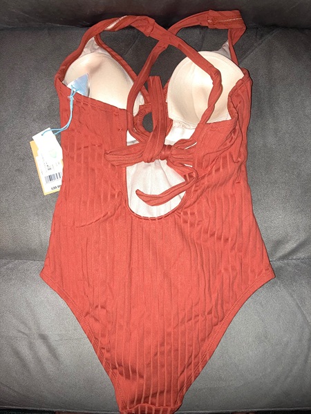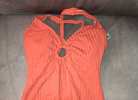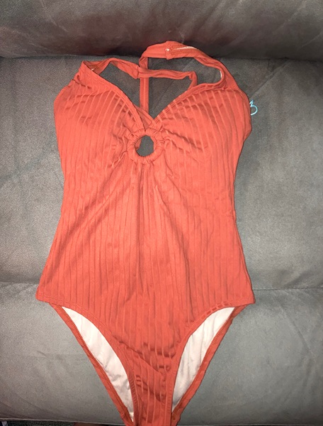 Brand is Kona Sol, size small (4-6). Medium coverage one piece with sewn in cups, crisscross back straps, keyhole front, apricot orange. Item is new with tags and hygienic liner. $10