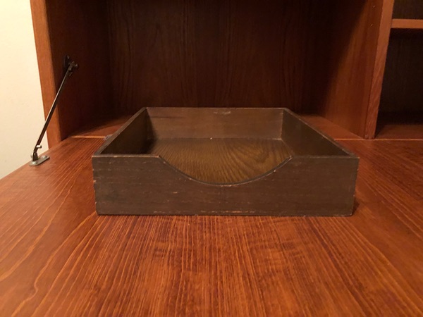 Dovetail construction. Felt on bottom to protect your surface and keep from sliding. Measures 10 x 12 and 1/2 inches. Mostly good condition. Asking $3.00.