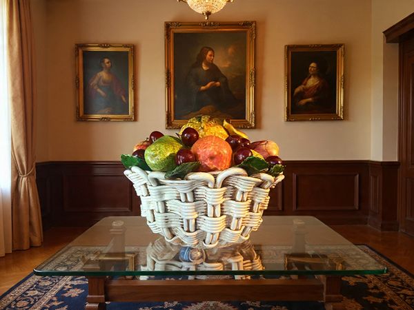 Italian glazed ceramic fruit basket figure. This polychrome compote is handmade with the greatest attention to detail, to a degree that the fruits are basically unrecognizable from real fruits. The basket is marked Made in Italy on the base. The fruits are amongst others; grapes, bananas, cherries, apple, pears, lemon and melon. Dimensions: Height: 26, 04 centimeters (10, 25 inches) Length: 36, 83 centimeters (14,5 inches) Depth: 38,1 centimeters (15 inches) Style Mid-Century. Technic Ceramic, Faenza, Hand & Paint made. Elaborated in Italy. Compare price. Delivery @ The Woodlands.