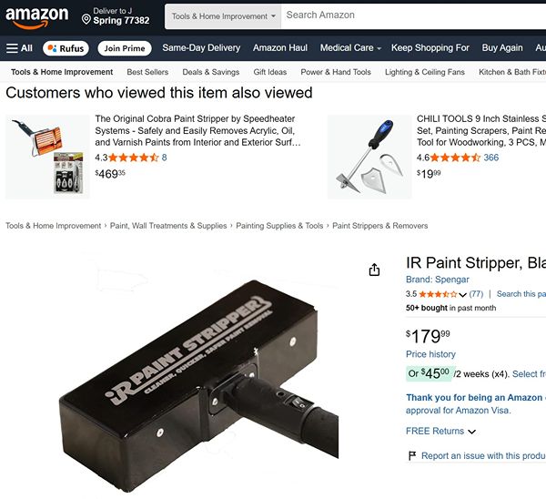 Spengar IR Paint Stripper, designed to remove paint and varnish using infrared technology. (Also this method is lead abatement safe, so dealing with any lead paint).Utilizes deep-penetrating infrared heat to soften paint without toxic fumes. Includes a metal housing and a ceramic heating plate. Ideal for stripping flat surfaces such as wood, doors, and trim. Works fantastic on older pieces with many years/layers of paint. It’s come with original box & owner’s manual, used only one time in a kitchen cabinet and works grate save a lot of time, practically new. Original Box . This method is lead abatement safe, so dealing with any lead paint,  used only one time in a kitchen cabinet and works grate save a lot of time, practically new.Delivery: The Woodlands Locally. Compare price on Amazon Retail price $ 179
