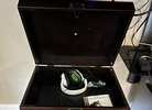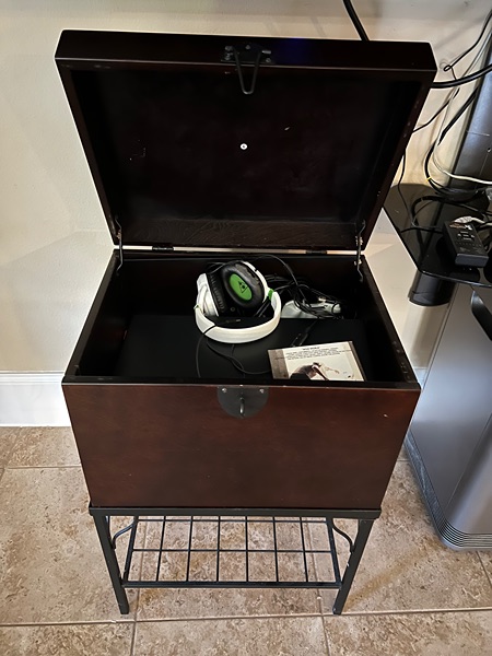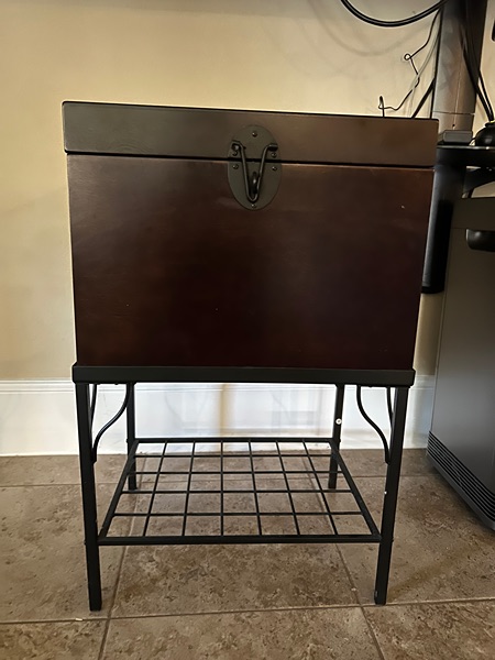Solid wood storage box on metal stand. Good for storing games and accessories. Text seller.
