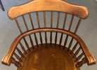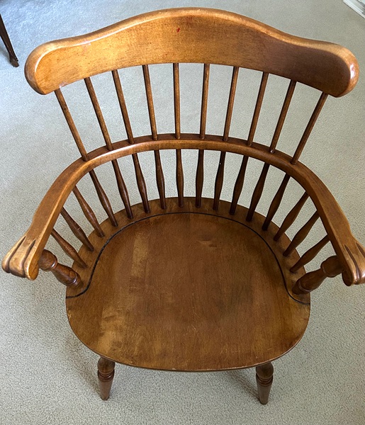 This wooden chair is solid, sturdy, and measures 33’ tall X 24’ wide X 21’ deep. Similar chairs online are selling for up to $1000. I'm not asking that much because I'm not sure of the manufacturer nor the type of wood (although most online are oak or maple). There are some scratches in the seat and some red spots along the top (mostly in the back) that look like red marker. This could be a fabulous accent chair if you're into restoring, refinishing, or restaining furniture. Pictures taken with and without flash so you can see how it looks in different lighting. $100