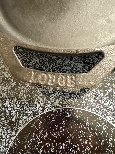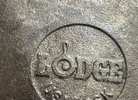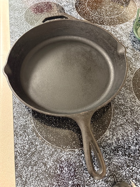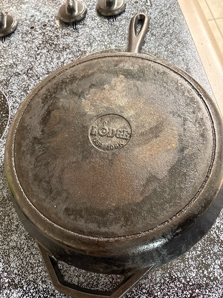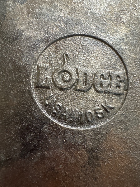 Lodge 10" cast iron skillet, seasoned and ready for cooking. Has grip handle so can be picked u with both hands