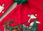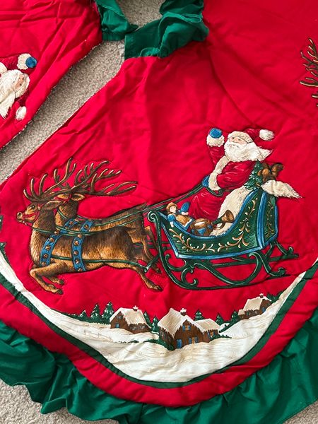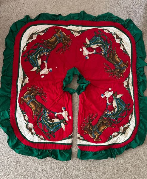Festive red and green quilted Christmas tree skirt featuring Santa and reindeer *** 37" x 36" *** Excellent/Like new condition Meeting location is Kroger 24350 Kuykendahl at West Rayford