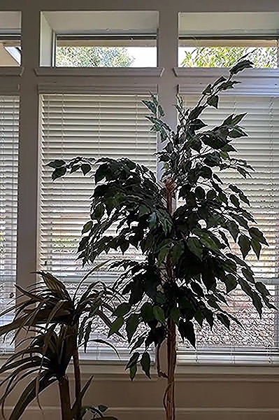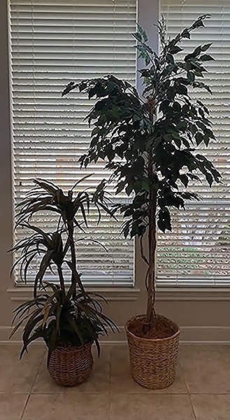 Two artificial trees plants in wicker baskets.  Tallest one (7’+) has little bird in nest and the shorter one is about 4’ tall…DISCOUNTED to $40 total, firm