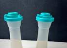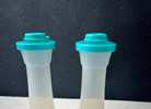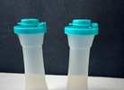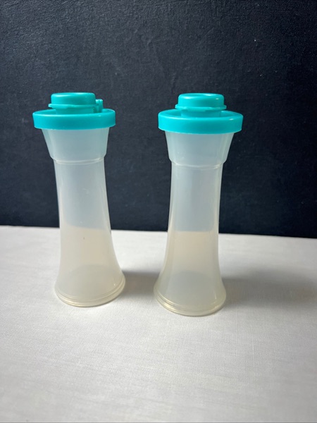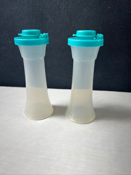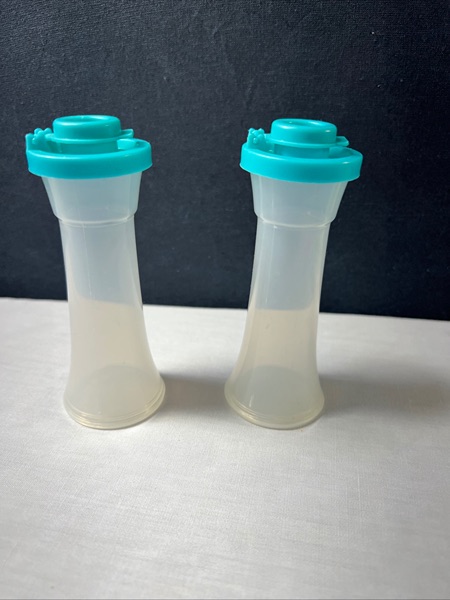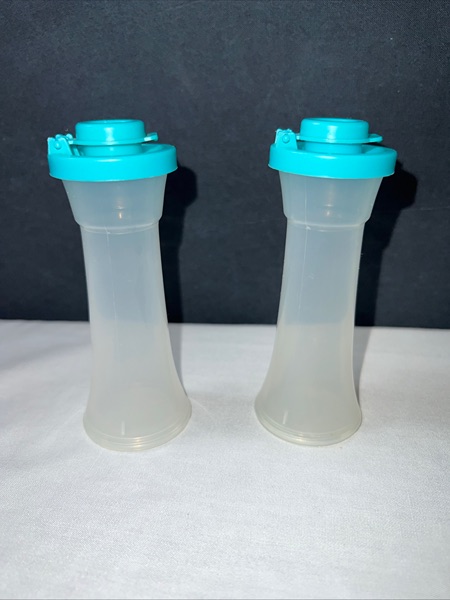 Tupperware Small 4” Hourglass Salt and Pepper Shakers. Clear bottom with teal or aqua tops. Easy to fill, tops pop off.