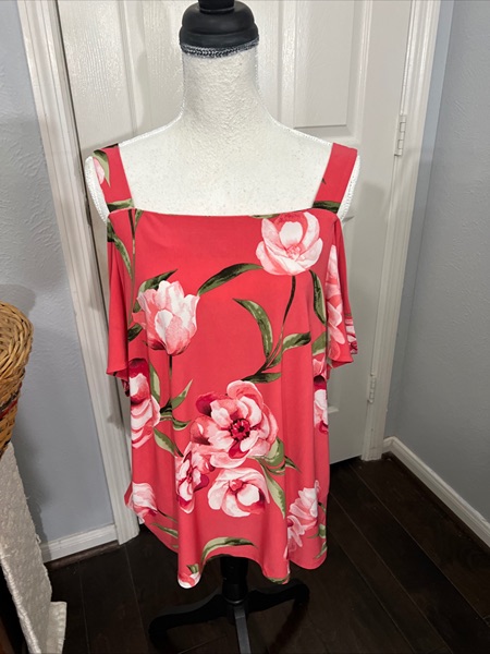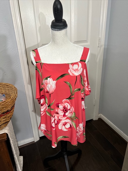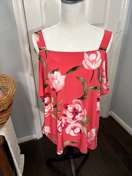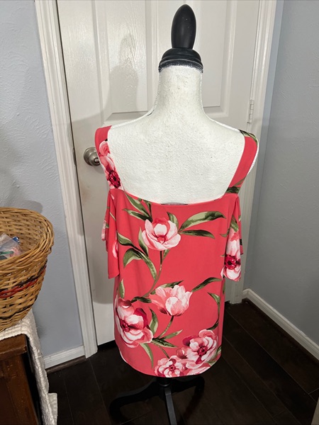 INC Womens Cold Shoulder size XL Tropical Pink Floral Flounce Blouse/Top. Strap sleeve, then open shoulder and remaining short sleeve. Type of strap to bottom of shirt, 26 inches. Under arm to under arm 20 inches. Polyester-spandex. Excellent used condition.