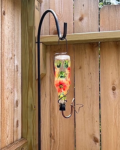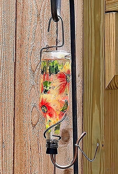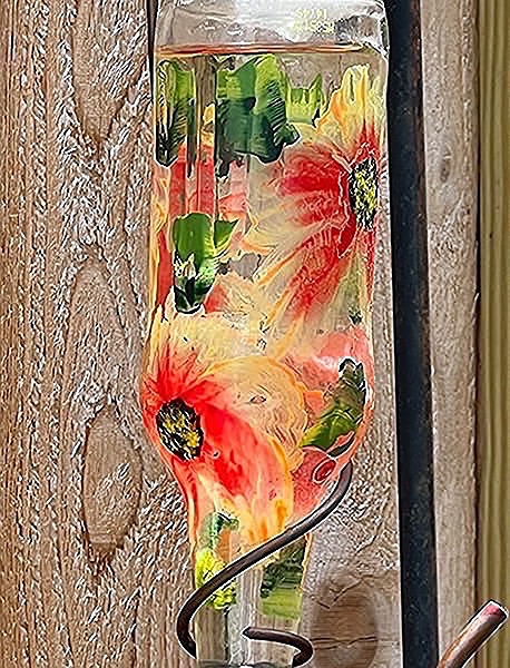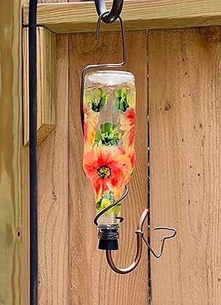 Hand-Painted Floral Glass Bottle Hummingbird Feeder with copper spout, perch and hanger…$20 firm
