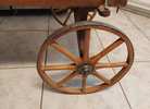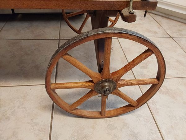 American Wooden Child's Wagon oak/hickory eight-spoke wheels on iron runner, tons of detailed work.