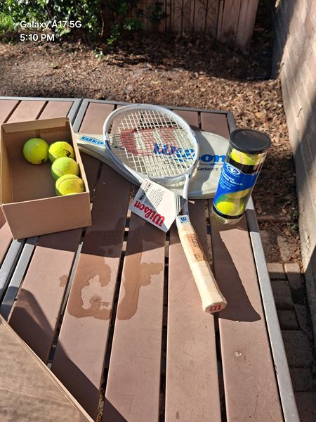 New Wilson racket. Still has tags on it. I just never used it. Now I am relocating and will not be taking it with me. Also balls and racket bag.