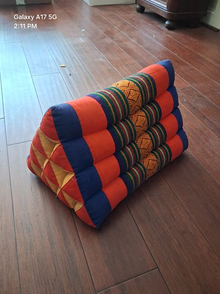 Thai triangle pillow. Buddhist ceremonial floor cushion. Use it for lounging, reading, relaxing or sunning. The possibilities are endless. Beautiful handcrafted bringing peace into a room with this comfortable and inviting pyramidal cushion. Great for lounging on the couch or floor, or for those who like to read in bed. In keeping with a centuries old tradition, this pillow makes the perfect lower back or neck support. Made in Northern Thailand using a technique that has been passed down for generations. Buddhist monks use them as floor cushions during meditation. Made by stuffing cotton cylinders made out of handloomed cotton or cotton blend with kapok fiber.