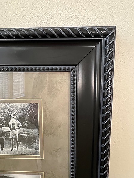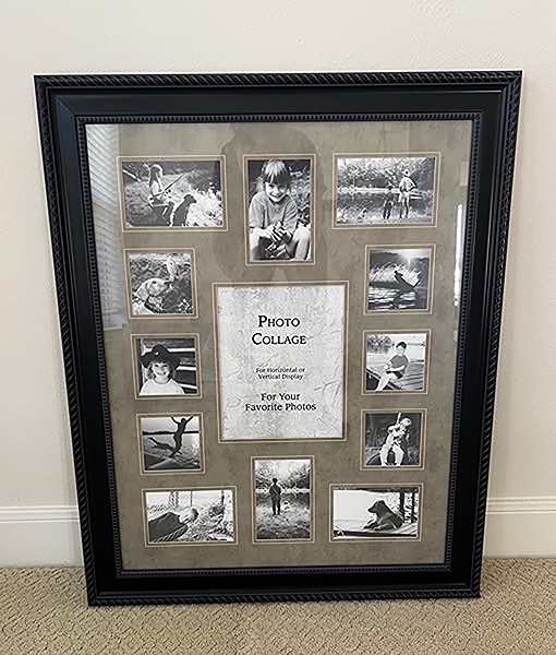 Beautifully framed glass picture collage with 13 photo slots. 22” x 28”. Like new!…$20 firm