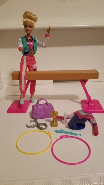 Barbie gymnast playset with bendable doll & accessories. Includes 2 leotards, warm-up suit shoes, & gym bag. Comes with balance beam, 2 rings, spinning clip, 2 clubs, trophy & medal. Very good condition.