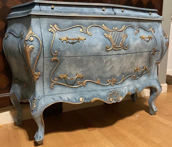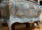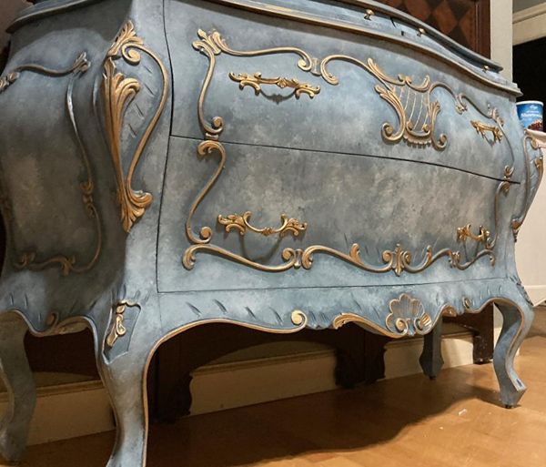 -We cleaned, filled, sanded, primed, painted and glazed in layers of blues, cream and grays then highlighted the details with gold gilding.