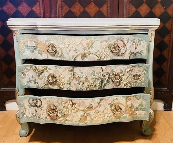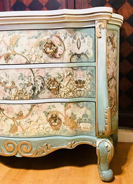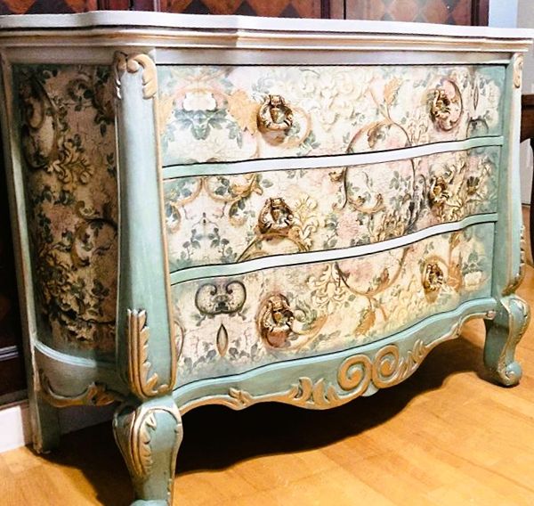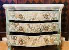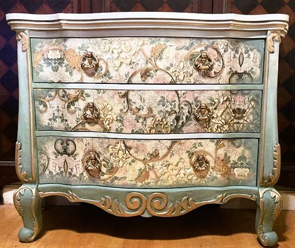 - We cleaned, filled, sanded, primed, blended shades of greens and golds, applied a complementary beautiful scroll design, gilded then sealed for durability.