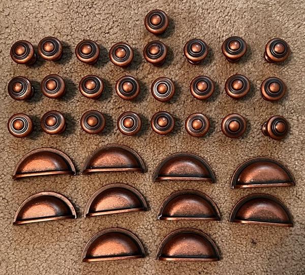 Cabinet door and drawer pull. 25 door knobs and 10 drawer pulls.