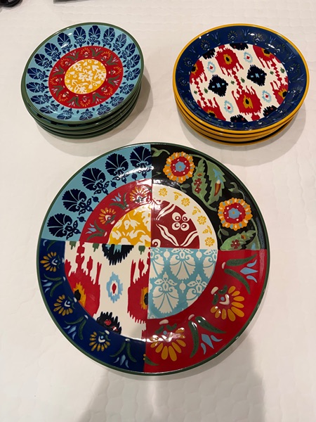Set of 12 dessert/salad plates 8" and a serving plate 14" Rosalita pattern from Pottery Barn all in excellent condition.