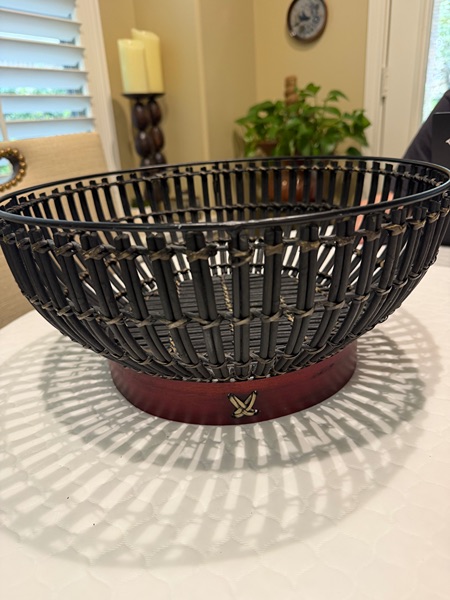 Large woven wicker decorative bowl. Measures 6 1/2" tall and 14" diameter in excellent condition. Purchased at Dillards for 65.00