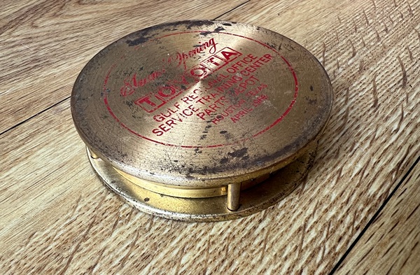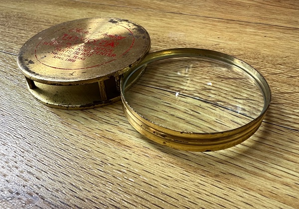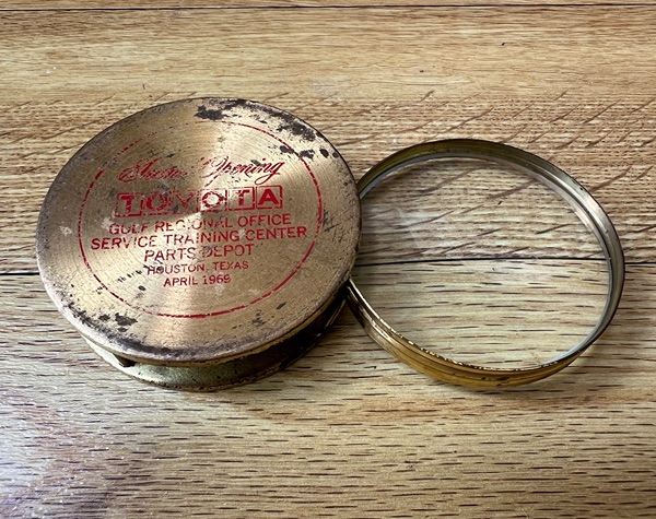 This vintage Toyota Gulf Regional Office Service Training Center Parts Depot commemorative brass magnifying glass is a collectible memorabilia piece from Houston, Texas, dating to April 1969.