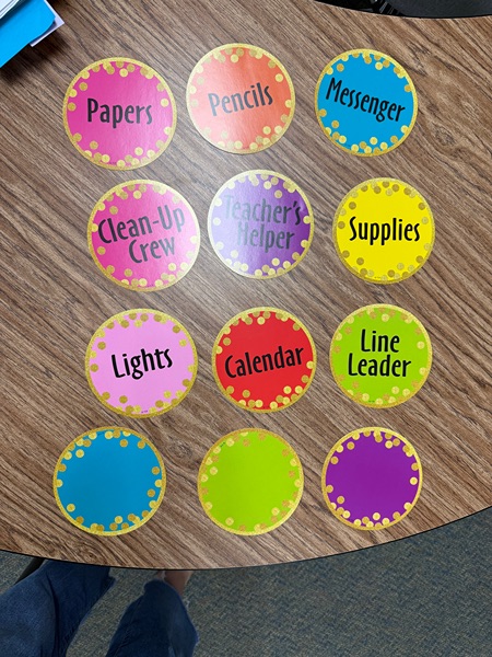 Laminated classroom calendar and job cards.