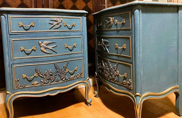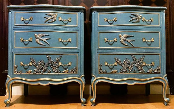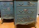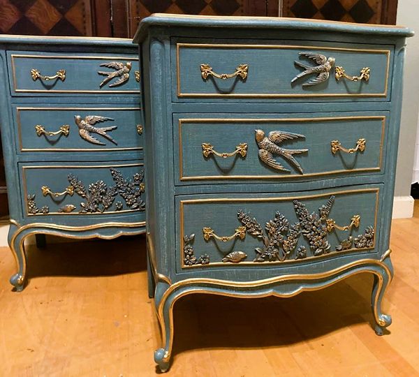 - We cleaned, filled, sanded, primed, added worn denim texture, applied hand poured moulds of birds and florals, then painted in layers, gilded and sealed for durability.