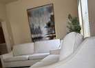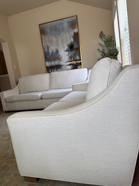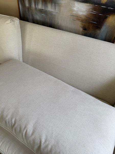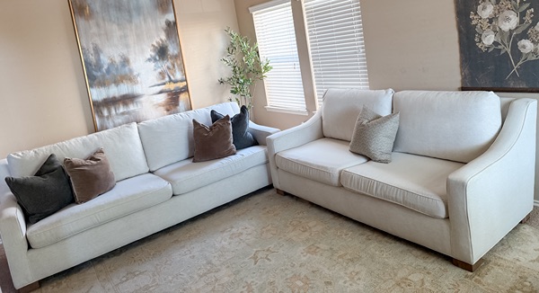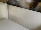 Beautiful white matching couches that are custom made. Top cushions are sturdy and VERY plumped with down fill. Deep seating & has a high back support. All covers are washable. Cushions are reversible. Minor wear. It’s in great condition.
