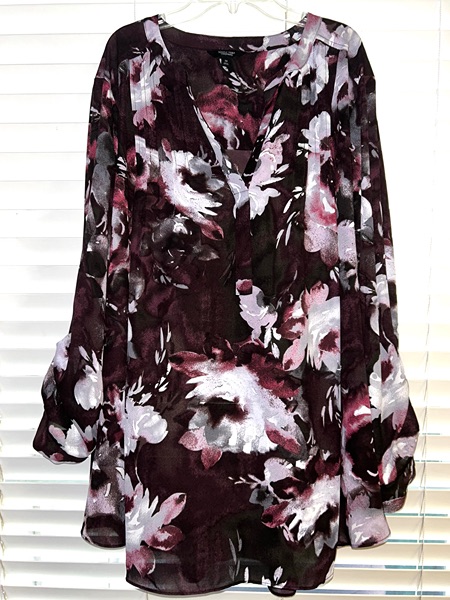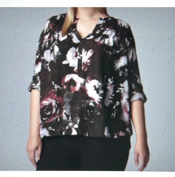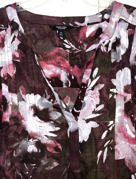 Simply Vera brand pintuck top, size 3X. Shirt is lightweight, sheer, with roll tab sleeves, hi-low hem, and official color is "stellar bouquet". 100% polyester. Excellent condition from smoke free home. $15