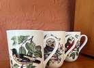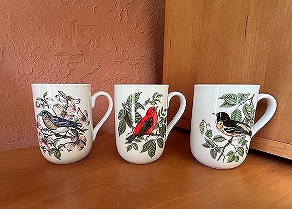 Featuring birds and flowers. Each measures approx. 4" high, 4" rim to handle, 2 3/4"diameter at mouth.
