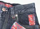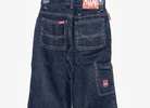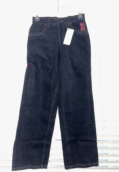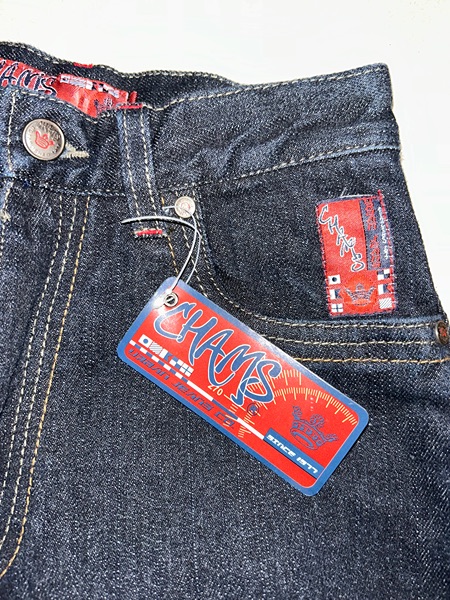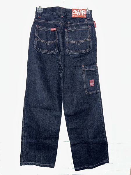 Chams brand boys jeans, size 14. They are new with tags but possibly vintage Y2K. Features include front pockets, back pockets, belt loops, red labels, contrast stitching, dark wash, wide legs, and baggy fit. Accents include a rivet crimped into the right side of the right thigh, which leads to a cargo pocket. Material is 55% ramie / 45% cotton. Inseam is 27 inches. Smoke free home. $15