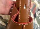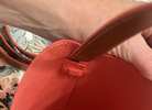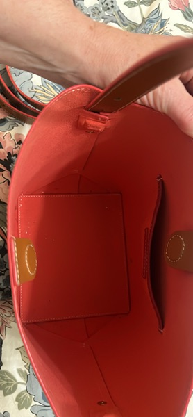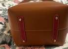 Rarely used and an excellent Condition. Tan leather handbag with extra shoulder strap and dust bag. Red felt lining And trim work.
