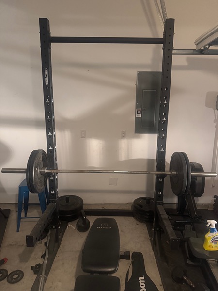 Weight rack - includes a bench and a barbell and 200 lb in weights