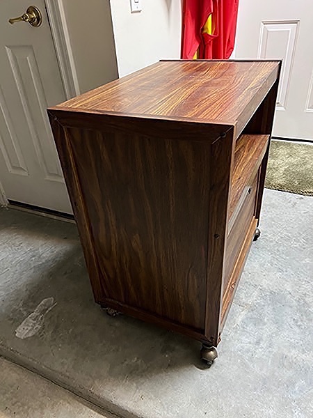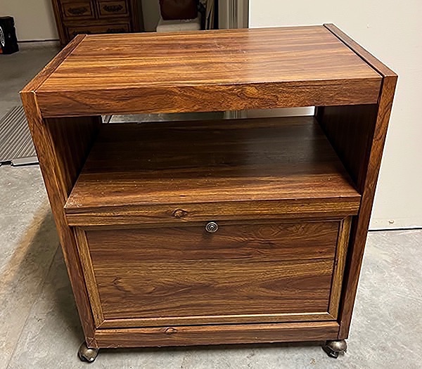 Bar or utility cart with cabinet on wheels. Nice paneled door that you may be able to reverse. Just needs a wipe down…$25 firm